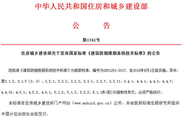 【安全公告】《建筑防煙排煙系統(tǒng)技術標準》GB51251-2017發(fā)布,2018年8月1日實施