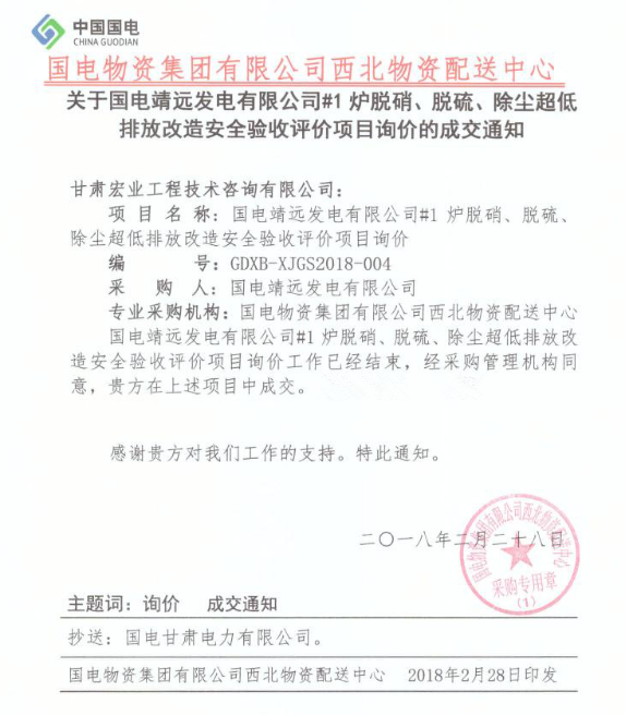 甘肅宏業(yè)工程技術咨詢有限公司中標國電靖遠發(fā)電有限公司#1爐脫硝、脫硫、除塵超低排放改造安全驗收評價